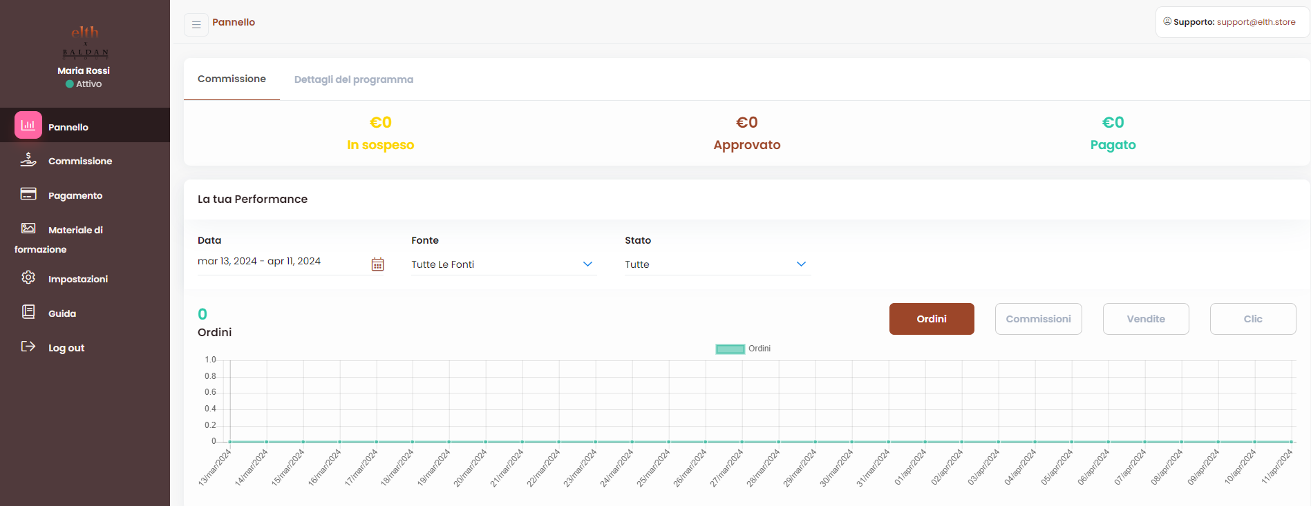 Le tue prestazioni: nella sezione Pannello puoi vedere quanti clic, vendite, commissioni e ordini hai ricevuto.